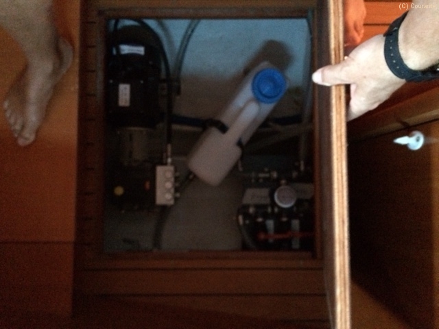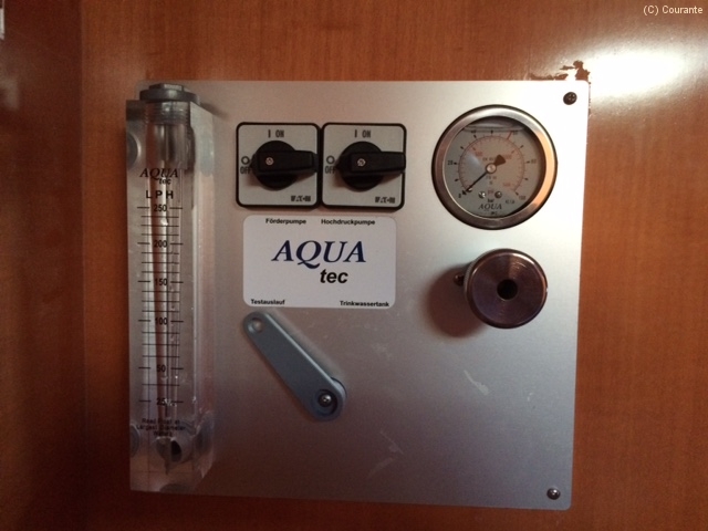 Unser Wassermacher der Firma Aqua Tec arbeitet nach dem Osmoseprinzip. Salzwasser wird von einer Förderpumpe über zwei Filter an eine Hochdruckpumpe (kennt man vom Kärcher) weitergeleitet. Diese Pumpe leistet immerhin 60 Bar Arbeitsdruck. Den wiederum muss man mit einem entsprechen hohen Stromeinsatz bezahlen, deshalb war der Generator unumgänglich. Mit diesem Druck wird das Wasser durch zwei Membranen gedrückt und aus 10 Litern Salzwasser wird ca. 1 Liter Trinkwasser gewonnen, die angereicherte Salzlake geht wieder über Bord.